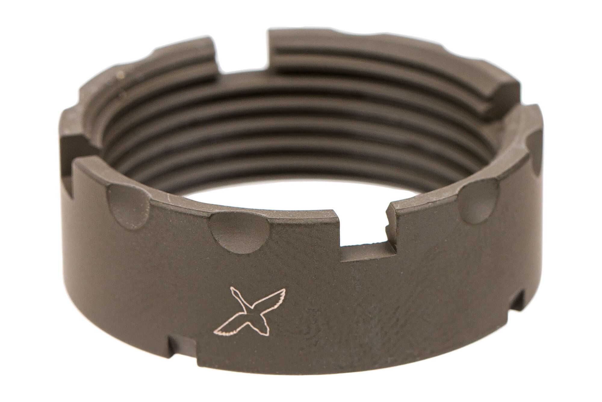 Military specifications require castle nuts to be staked in two locations to ensure the castle nut and buffer tube will not loosen without deliberate action, and FCD believes this is one of those points where less is definitely not more. Traditional MIL-SPEC castle nuts have 3 staking notches, the CNF features 4, ensuring at any time three are available to be used. Each notch has also been upgraded to a deep, 30-degree cut, making them 25% longer than MIL-SPEC to ensure enough material can be staked into the notch for secure installation. To make threading the castle against the end plate even easier, the outer edge features coarse serrations.